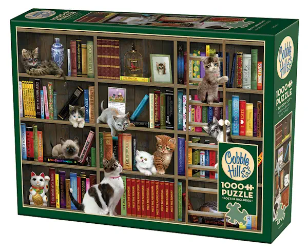 Palapeli kutsuu sinut matkalle viihtyisään kirjastoon, jossa uteliaat kissanpennut kiipeilevät hyllyillä ja tutkivat kirjoja, tehden lukuelämyksistä entistäkin hauskempia. Tässä palapelissä on uniikit palat ja mukana 35cm X 25,4cm juliste.